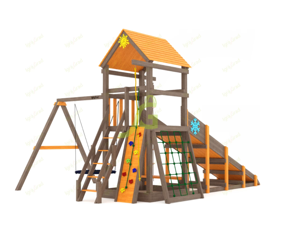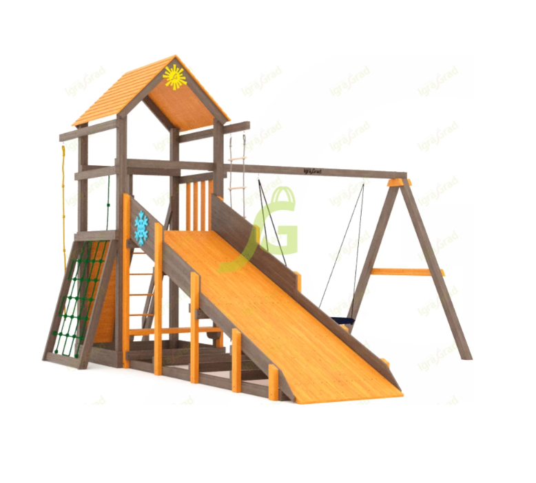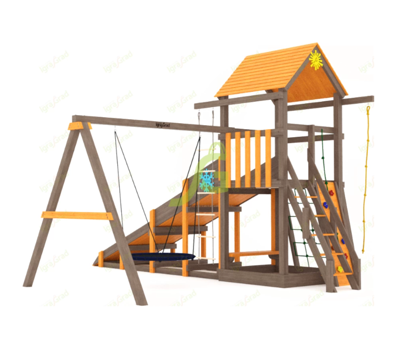 По желанию клиента игровая площадка может быть укомплектована дополнительными элементами. Можно заменить обычные качели на качели-гнездо, которые очень удобны в использовании. Наши специалисты обсудят с вами все детали заказа и быстро оформят заявку.