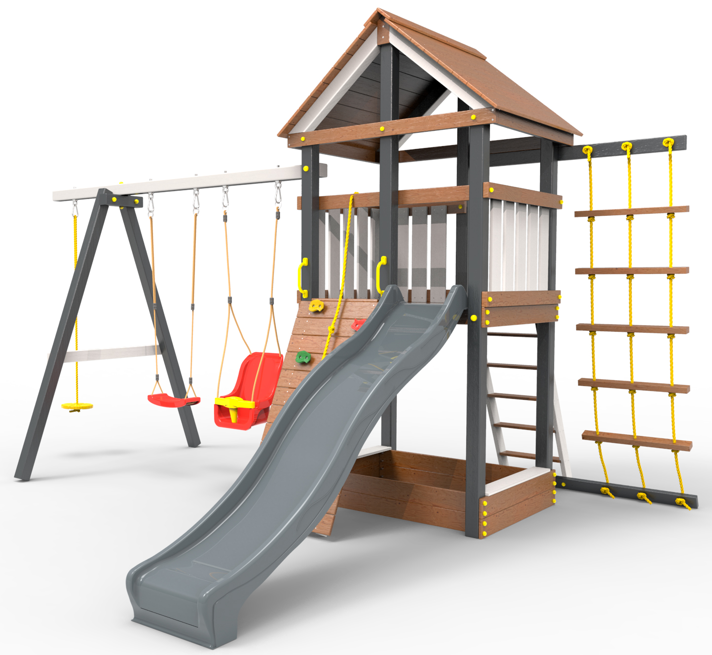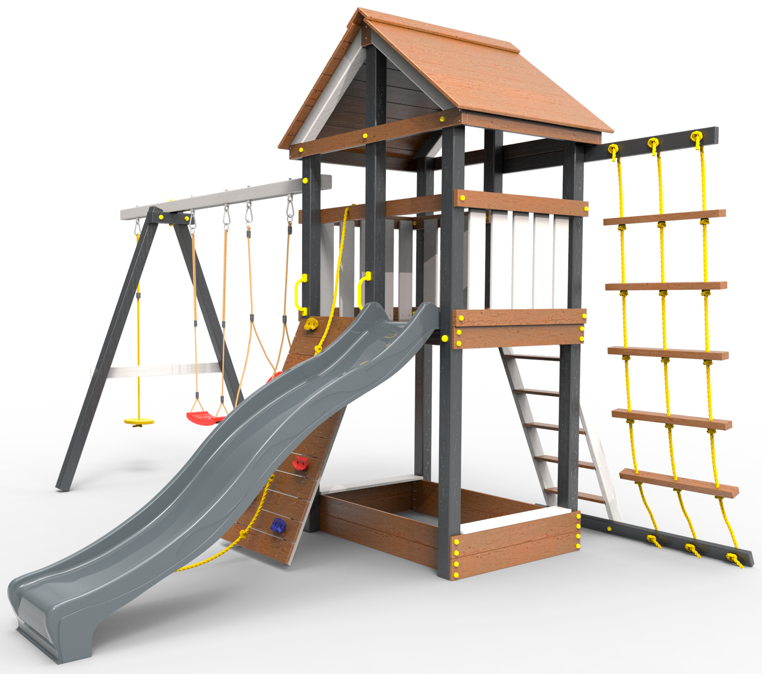 Детская площадка «Пикник Ультра 2.3 » является одной из вариантов комплектации флагманской модели "Ультра" и представляет собой двухуровневую конструкцию, на первом уровне которой расположена песочница, а второй этаж представляет собой игровое пространство под деревянной крышей. Конструкция оснащена качельной балкой, повышенной прочности, которая имеет 5 креплений для качелей или любого другого навесного оборудования, шторм-трапом ,горкой и скалодромом! .