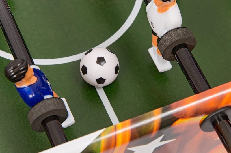Настольный футбол «Mini S» компактных размеров. Яркий дизайн и стильные хромированные штанги черного цвета. Игроки прокрашены хорошо, поле сделано из МДФ с зеленой ламинацией. Разметка чёткая. В комплекте два мяча и инструкция по эксплуатации.