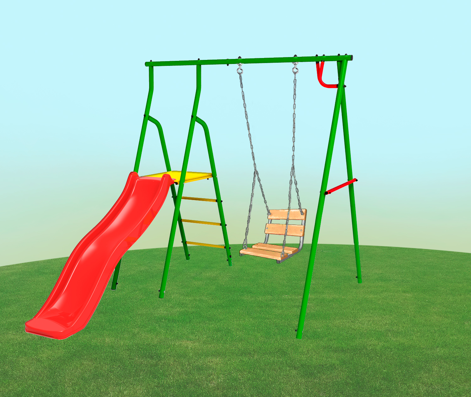 — Комплектация: горка пластиковая 1,6 м, подвесные цепные качели со спинкой